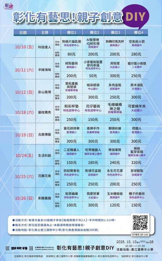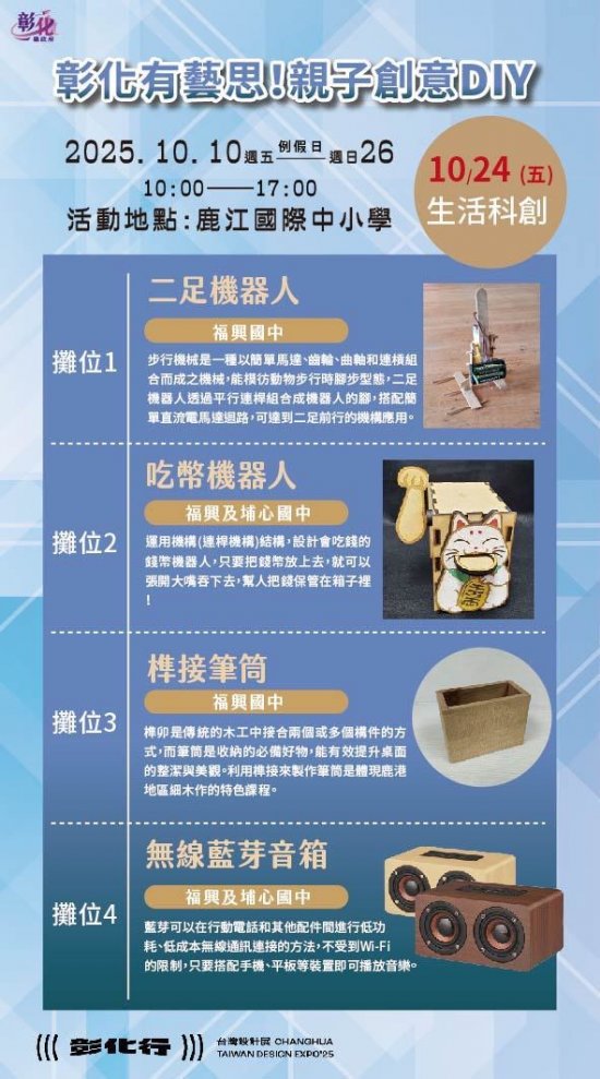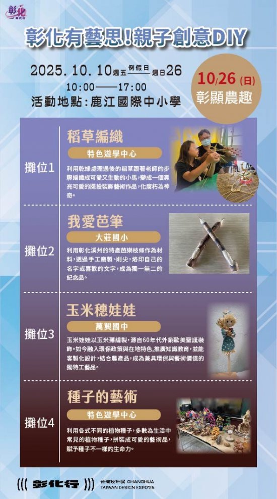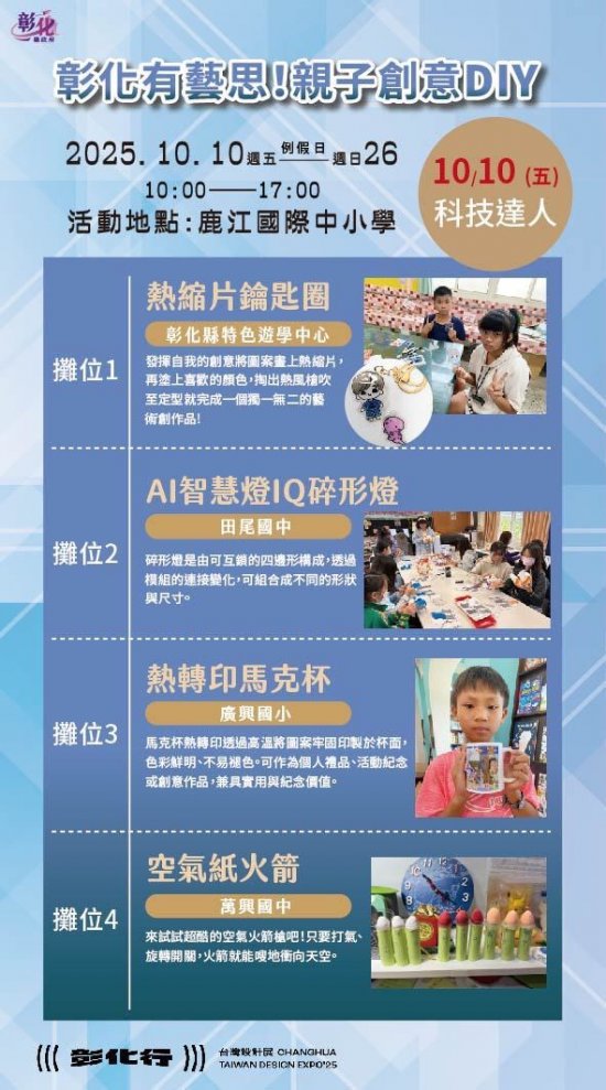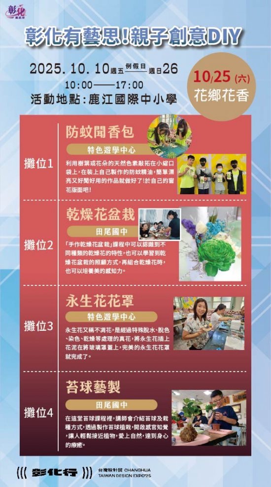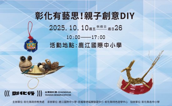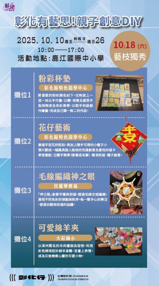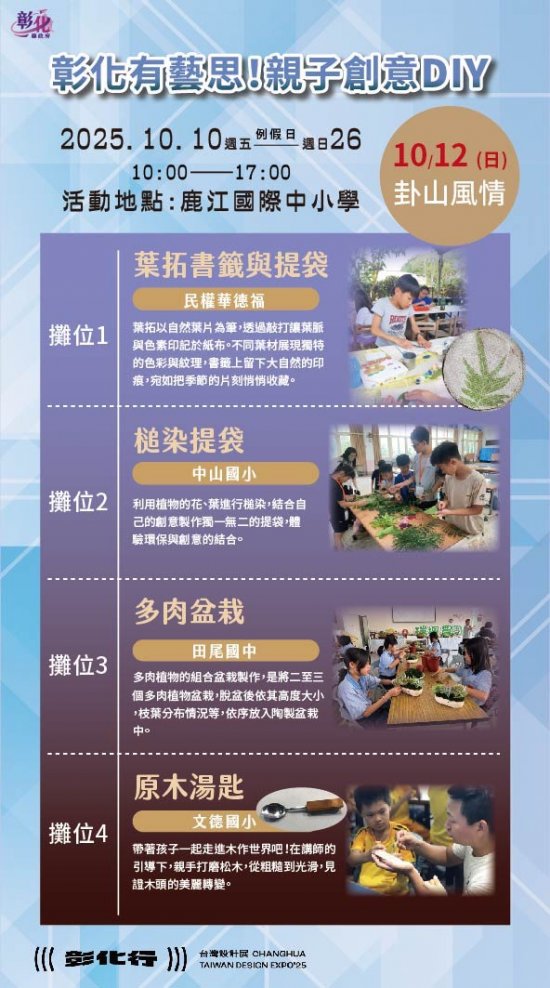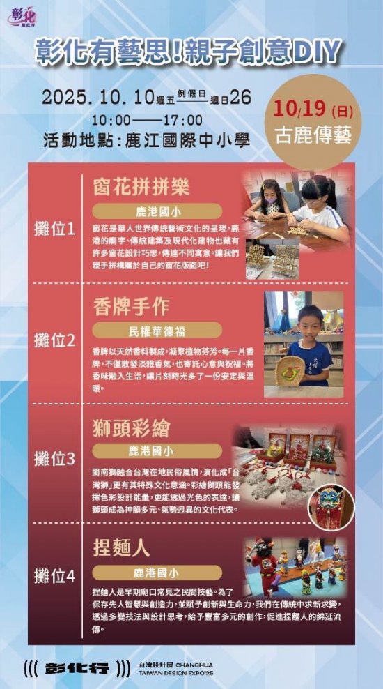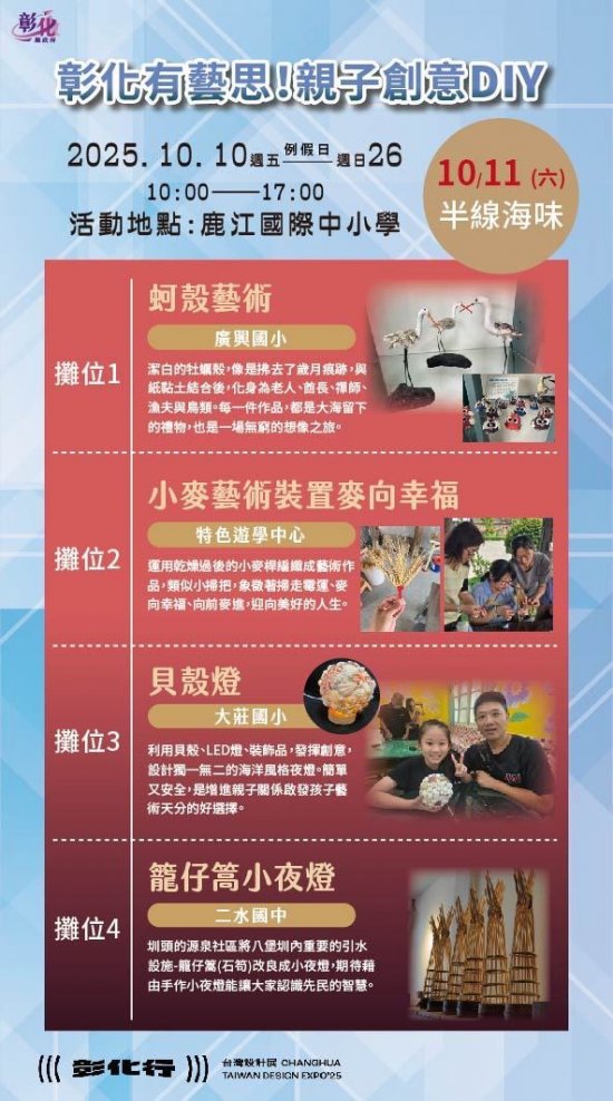 一、2025台灣設計展首度移師彰化,以《彰化行》為主題,創歷年最大規模 ,其中「彰化有藝思!親子創意DIY」特設攤位於鹿港鎮鹿江國際中小學,由彰化縣在地藝術家現場帶領民眾手作,體驗來自彰化縣各國中小最夯的在地特色課程。