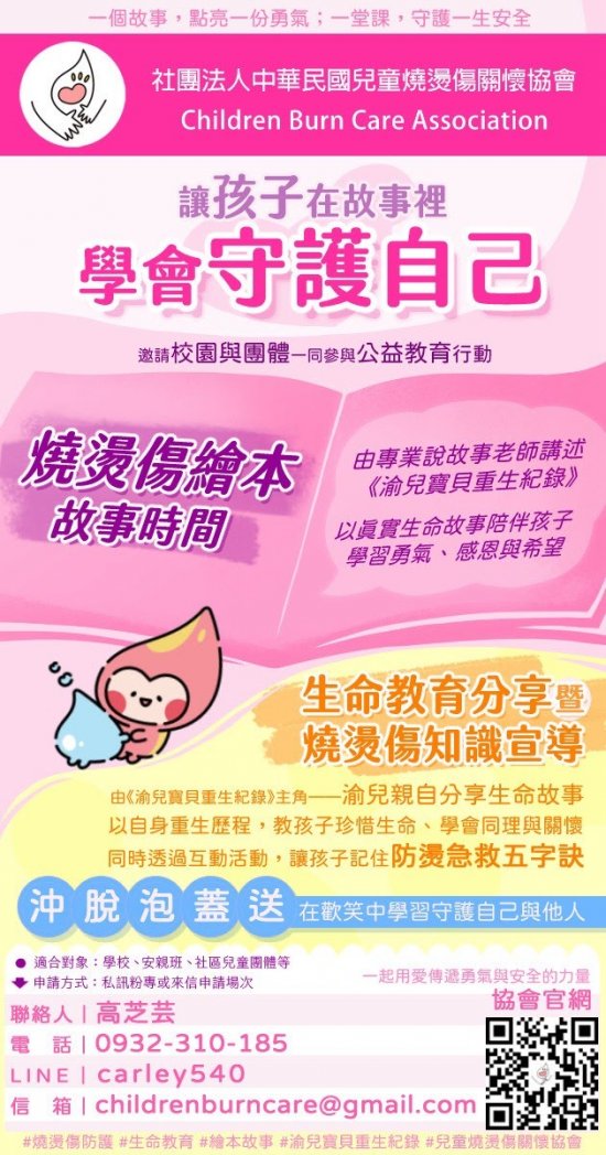 一、為提升兒童及青少年對燒燙傷防護與急救的正確認知,並透過真實生命故事推廣生命教育,中華民國兒童燒燙傷關懷協會辦理「燒燙傷繪本故事時間」及「生命教育分享暨燒燙傷知識宣導」公益校園巡迴活動。