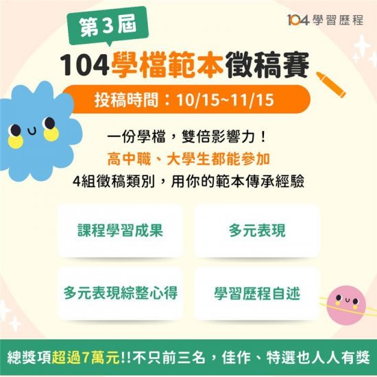七、參賽獎勵:凡通過審核皆可獲獎狀,競賽總獎金逾7萬元,將頒發給各類作品的前三名、佳作,並會於高中組另選出10位特選、高職組選出18位特選提供加碼獎金。