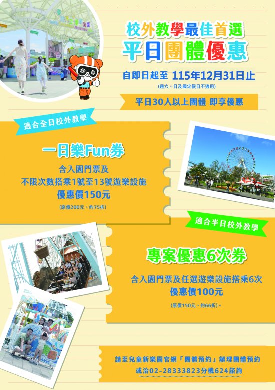 三、 前述優惠資訊,另可於兒童新樂園網頁「申請資訊」辦理團體預約,或於營業時間洽服務專員翁小姐(連絡電話:02-28333823分機624)諮詢。