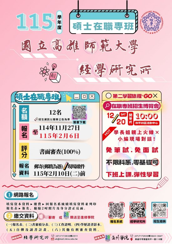 (四)資料審查:115年2月10日(星期二)前(郵戳為憑或親送至高雄師範大學進修學院)。