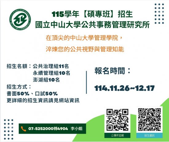 國立中山大學公共事務管理研究所開設之「公共事務管理碩士在職專班」招生資訊