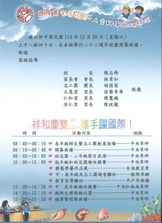 朴子市祥和國小謹訂於114年12月20日(星期六)辦理創校22周年校慶園遊會,歡迎各界來賓及校友蒞臨,