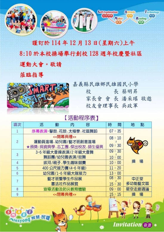 嘉義縣民雄鄉民雄國民小學謹訂於114年12月13日(星期六)舉辦創校128週年校慶運動會,歡迎各級長官來賓蒞校指導,並於114年12月15日(星期一)補假一天,如有緊急公務聯繫,請洽相關承辦人員。(檢附邀請卡)