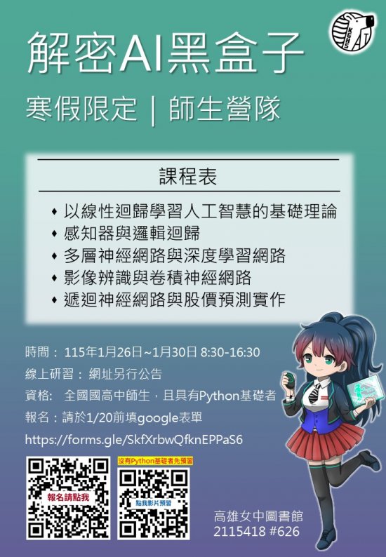 轉知高雄女子高級中學辦理「115年寒假限定|解密AI黑盒子:師生營隊」一案,請鼓勵師生踴躍報名參加,詳如說明。