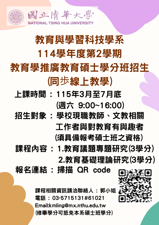 二、相關訊息公告於國立清華大學教育與學習科技學系系網 (網址:http://delt.site.nthu.edu.tw/),如有相關問題請逕洽郭小姐(連絡電話:03-5715131分機61021,電子信 箱:kmling@mx.nthu.edu.tw)。