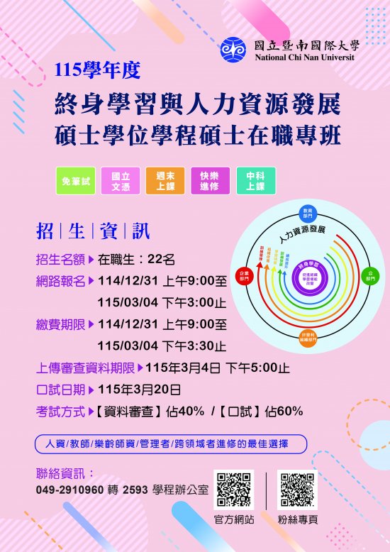 國立暨南國際大學115學年度終身學習與人力資源發展碩士學位學程碩士在職專班招生簡介