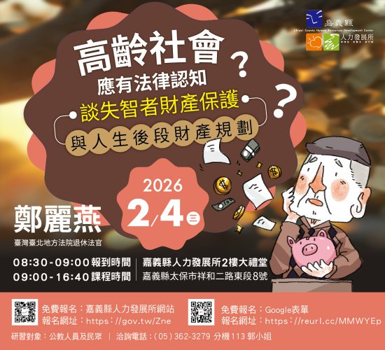 嘉義縣人力發展所特別邀請臺灣臺北地方法院鄭麗燕法官(退休)分享「高齡社會應有法律認知‒談失智者財產保護與人生後段財產規劃」主題,從失智長者可能面臨的法律風險談起,延伸至繼承與遺囑規劃,在安心交棒的時刻,成就一段無憾的人生。