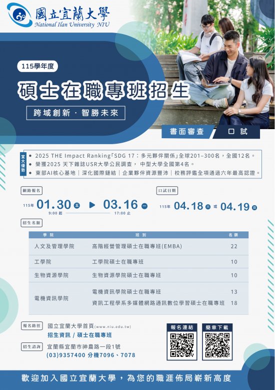 一、宜蘭大學於115學年度碩士在職專班招生一律採網路報名,報名日期:自115年1月30日(五) 上午9時起至115年3月16日(一)下午5時止,報名網址:https://ccsys.niu.edu.tw/exam/emsexam/。