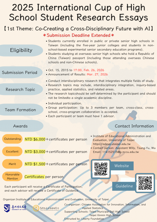(二)聯絡窗口:臺北市立大學教評所吳助理(Email:114152515@g.nccu.edu.tw);羅助理(連絡電話:02-23113040分機8434;Email:international.cup.adeva@gmail.com)。