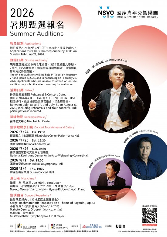 (四) 曲目、甄選樂器及相關資訊請詳閱甄選海報及簡章,或可於以下網站查詢及報名https://www.npac-nso.org/nsyo/Auditions。