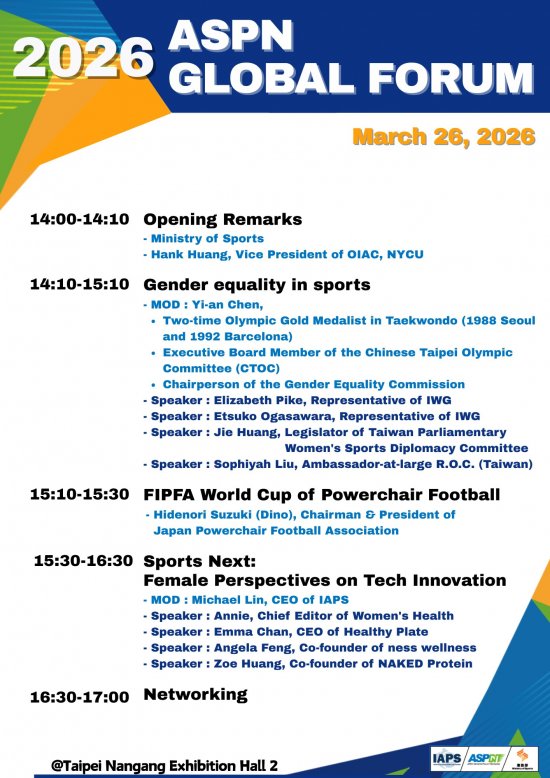 二、旨揭論壇係運動部辦理「APEC運動政策網絡(ASPN)」相關活動之一,並結合「2026年台灣國際運動及健身展(TaiSPO)」辦理,訂於115年3月26日(星期四)下午2時至5時於**南港展覽館2館大舞臺區(臺北市南港區經貿二路2號)**舉行。