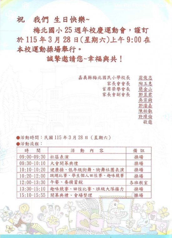 公告! 本校於115年3月28日(星期六)辦理創校25週年暨社區聯合校慶運動會,於3月30日(星期一)補假一天,如有公務聯繫,請逕洽各業務承辦人,不便之處敬請見諒。