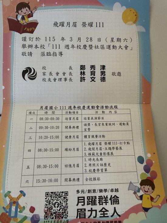 嘉義縣新港鄉月眉國民小學謹訂於115年03月28日(星期六)辦理第111週年校慶學生成果發表會暨社區聯合運動會慶祝活動,竭誠歡迎長官、來賓及校友蒞臨指導!並於115年4月2日(星期四)補假一天,當日如有公務聯繫,請逕洽各業務承辦人,不便之處敬請見諒