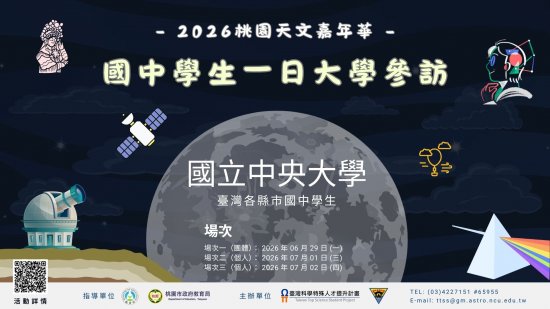 主旨: 國立中央大學訂於115年6月29日、7月1日及2日辦理「2026桃園天文嘉年華—國中學生一日大學參訪」活動,歡迎各國中學生踴躍報名參加。