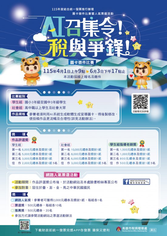 高雄市稅捐稽徵處為提升民眾對租稅常識之認識,舉辦「AI召集令!稅與爭鋒!」圖卡徵件比賽暨人氣票選活動,請鼓勵學生踴躍投稿。