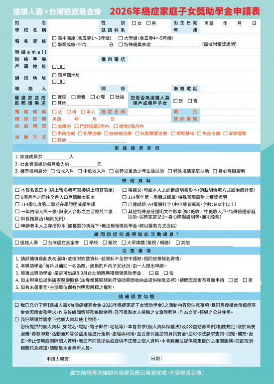 2026台灣癌症基金會x遠雄人壽-癌症家庭子女獎助學金(如附件)
