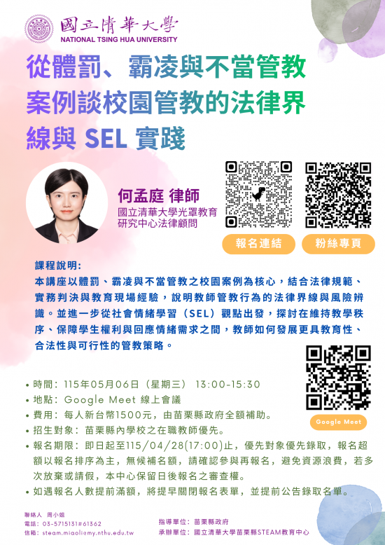 二、 課程簡介:本講座以體罰、霸凌與不當管教之校園案例為核心,結合法律規範、實務判決與教育現場經驗,說明教師管教行為的法律界線與風險辨識。並進一步從社會情緒學習(SEL)觀點出發,探討在維持教學秩序、保障學生權利與回應情緒需求之間,教師如何發展更具教育性、合法性與可行性的管教策略。